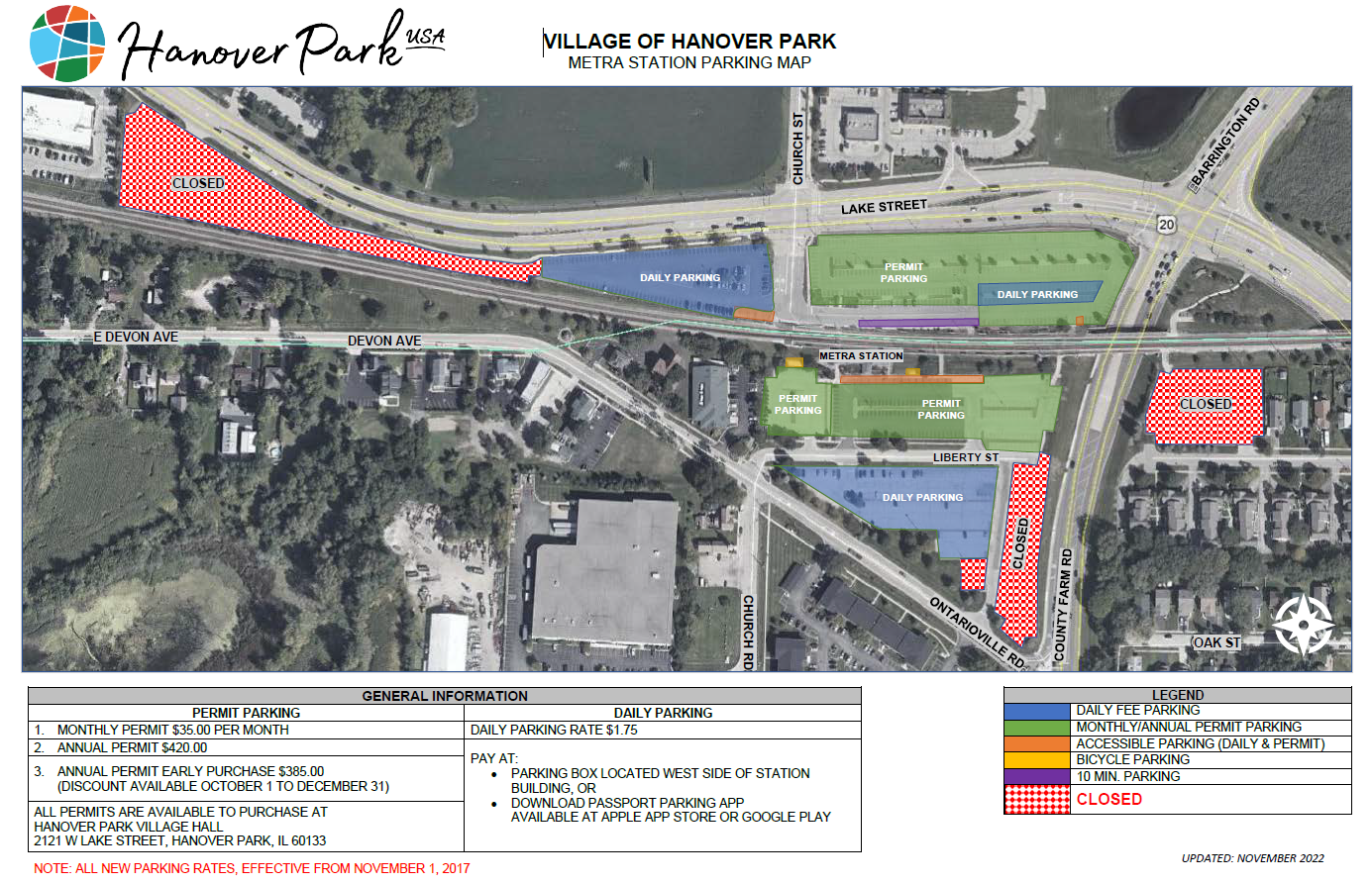 The Village of Hanover Park maintains three Metra parking lots with a combined 832 spaces. Parking lots are located on Lake Street, Ontarioville Road and Liberty Street. Parking regulations are enforced Monday through Saturday, 24 hours a day. Daily Fee parking is only available at the Lake Street and Ontarioville Road parking lots. The current daily fee rate is $1.75.