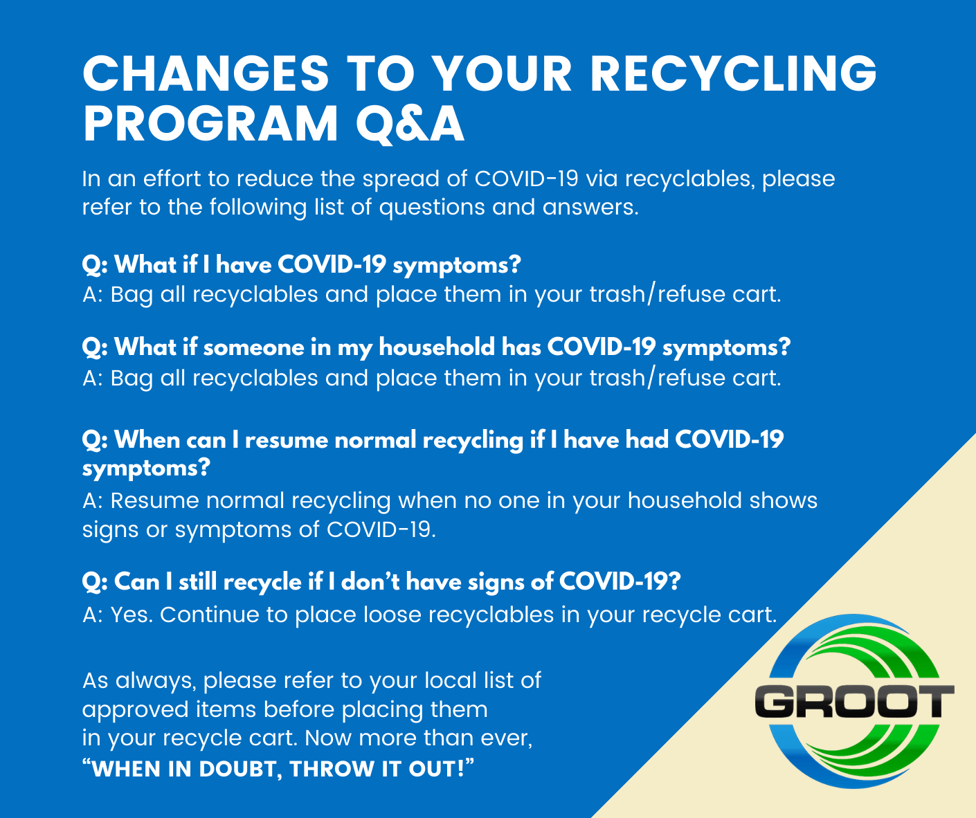 Changes To Your Recycling Program From Groot In an effort to reduce potential exposure to personnel, if you or someone in your household has tested positive for COVID-19, or is exhibiting symptoms related to COVID-19, please bag your recyclables and place them in your trash/refuse cart. Please continue this practice until symptoms subside. If there are no signs of COVID-19 in your household, please continue to place your loose recyclables in your recycle cart.