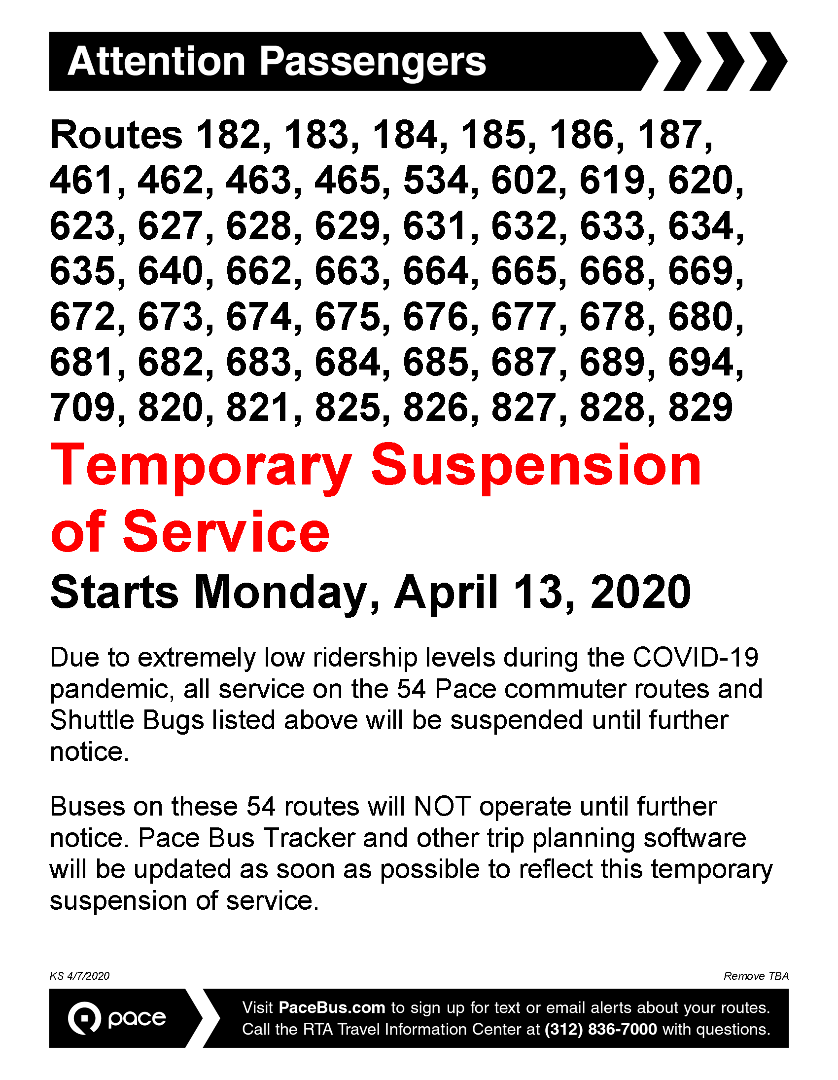 Temporary Suspension of Service From PaceThis does not impact Route #554 in Hanover Park.Due to extremely low ridership levels during the COVID-19 pandemic, all service on the 54 Pace commuter routes and Shuttle Bugs listed above will be suspended until further notice. Buses on these 54 routes will NOT operate until further notice. Pace Bus Tracker and other trip planning software will be updated as soon as possible to reflect this temporary suspension of service.