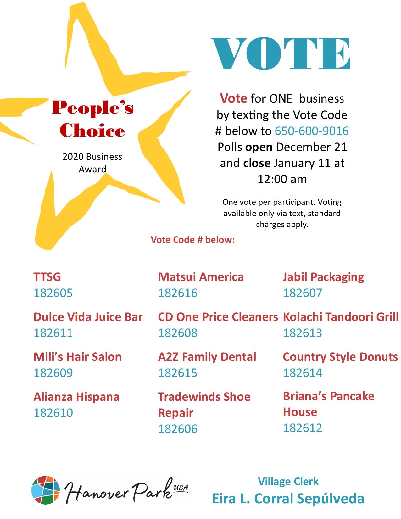 Congratulate each of these businesses on their nomination for “Business of the Year!” Each may now be considered for the "People's Choice Award" and the Economic Development Committee will choose the Business of the Year. Help choose the "People's Choice winner. Vote for ONE business by texting the Vote Code # to 650-600-9016. Polls are open until January 11 at 12:00 a.m. Voting available only via text, standard charges apply. A2Z Family Dental 182615 Alianza Hispana 182610 Briana’s Pancake House 182612 CD One Price Cleaners 182608 Country Style Donuts 182614 Dulce Vida Juice Bar 182611 TTSG 182605 Jabil Packaging 182607 Kolachi Tandoor Grill 182613 Matsui America 182616 Mili’s Hair Salon 182609 Tradewinds Shoe Repair 182606