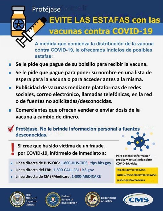 Avoid COVID-19 ScamsAs COVID-19 vaccine distribution begins, here are signs of potential scams:- You are asked to pay out of pocket to get the vaccine.