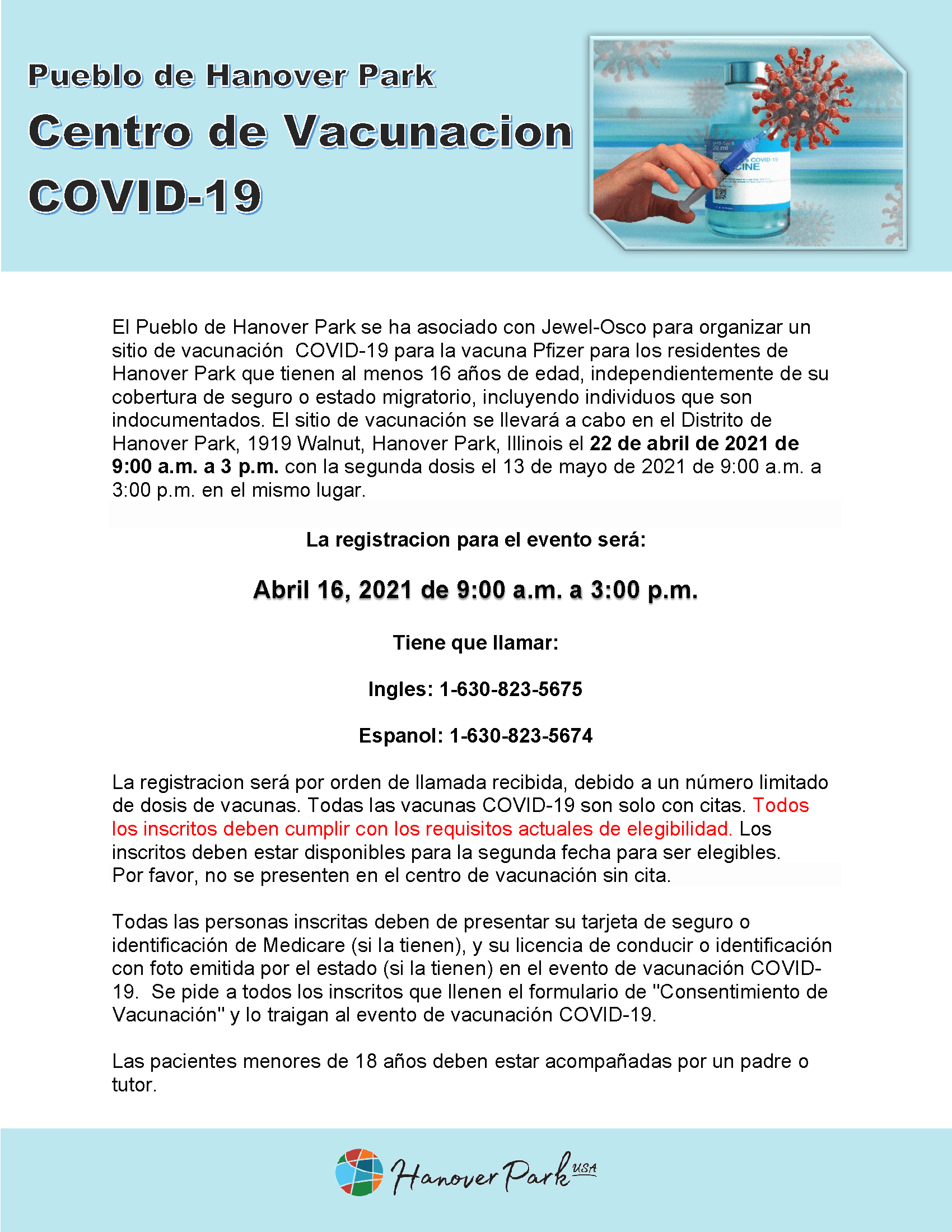 The Village of Hanover Park has partnered with Jewel-Osco to host a Pfizer vaccination site for Hanover Park residents who are at least 16 years-old, regardless of their insurance coverage or immigration status including individuals who are undocumented. The vaccination site will be held at the Hanover Park Park District, 1919 Walnut, Hanover Park, Illinois on April 22, 2021 from 9:00 a.m. to 3:00 p.m. with the second dose on May 13, 2021 from 9:00 a.m. to 3:00 p.m. at the same location.